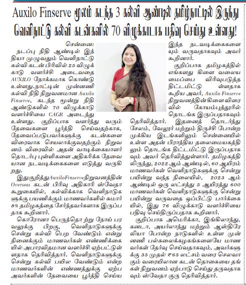 Shweta Guru, CBO – Overseas Loans, Auxilo informed "About 8% of all students travelling for overseas education are from Tamil Nadu. Post covid, there has been an exponential growth in student numbers for overseas education and to meet this increasing demand, we have planned to gradually expand our branch network in Tamil Nadu”.